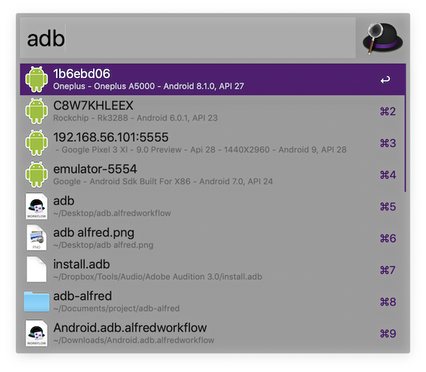 apkto search for local apk files, and check package infoapkfto directly list apk files under current front Finder windowavdto list installed emulators, select one to start an emulator