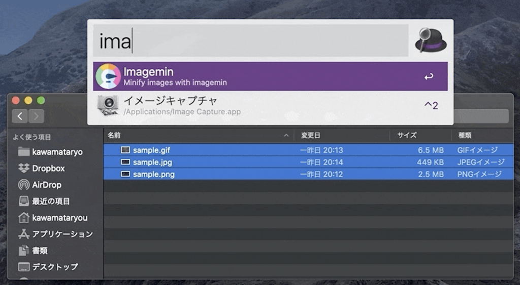 Selected image files on finder, type imagemin and enter in Alfred.