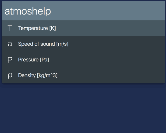 atmos <query>— Show values for altitude . Defaults to meters, but if query ends inforft, the proper conversion is made.↩or⌘+<NUM>— Copy result to clipboard -atmoshelp— Describe values.