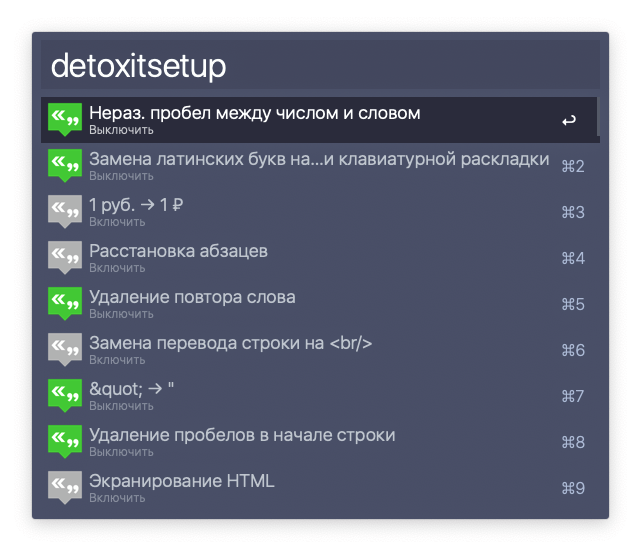 Detoxit! помогает одним движением избавить текст от большинства «болячек» — неправильных кавычек, дефисов вместо тире, двойных пробелов и множественных переводов строки (всего около 100 правил).