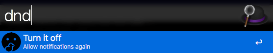 This workflow toggles the Do Not Disturb feature of macOS, optionally for a given length of time. It was inspired by CalmNotifications, but allowing for automatically toggling back after a time period as well as using a different method to toggle so that the status indicator (dimming of the notification icon) works correctly.