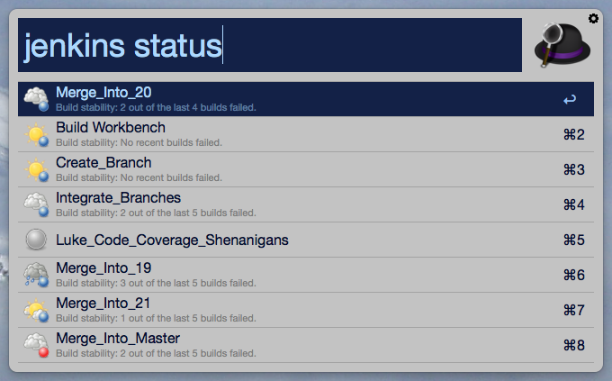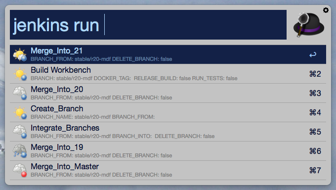 This will return a list of any jobs that are configured to run using the api (token setup - http://stackoverflow.com/questions/21032349/how-can-i-set-the-jenkins-authentication-token) and the parameter names associated to each job. You can specify values for each parameter within the alfred prompt (if any), all separated by 2 spaces. If you have the gitrepo set, this will default to the first parameter value...you can override by typing something else for param1 OR retain that value by simply inserting 2 spaces and moving onto the next param.