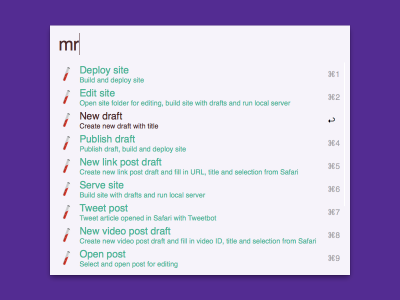 Publish draft: Lets you choose an existing draft, adds the current date to the beginning of the filename and moves it to the _posts folder. Builds the site and deploys it to your remote server. Opens your site in the standard browser.
