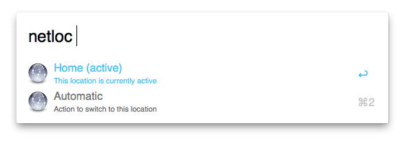 netloc [<query>]— Show list of network locations filtered by<query>if one is specified↩— Activate selected network location⌘+↩— Open Network Preferences
