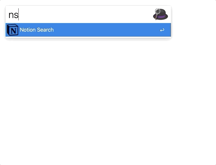 Simply type your keyword into Alfred (default: ns) to see instant search results from Notion that mimic the Quick Find function in the Notion web app. Selecting a search result takes you to that page in Notion in your default web browser.