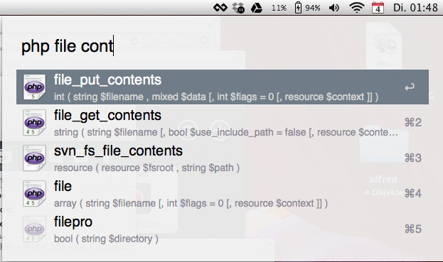 You can see the best results at the top, and some results, which could be interesting with a lower opacity. Removed PHP functions gets a red cross and deprecated functions an exclemation mark sign.