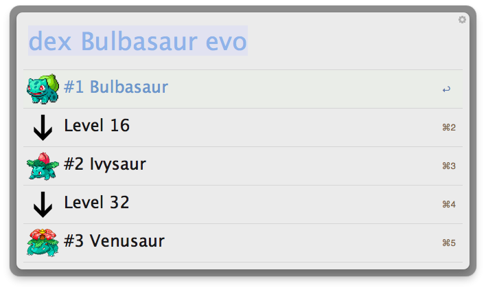 Features: - Works offline. - Pokémon Info: + Types Example: "dex bulbasaur" Pro tip: Press Enter on the Pokémon type to use Super Effective! workflow and check the effectiveness of your attacks. + Moves learnt by Level up Example: "dex bulbasaur lvl" + Moves learnt by TM Example: "dex bulbasaur tm" + Moves learnt by HM Example: "dex bulbasaur hm"