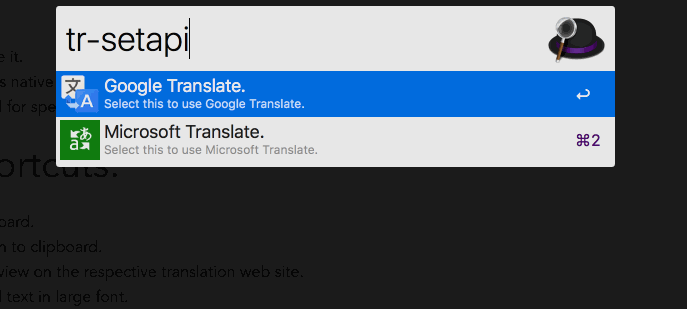 tr: translate query.tr-setapi: select Google or Microsoft Translate service.tr-setkey: set your API key.tr-setlang: set target language (language to translate to).
