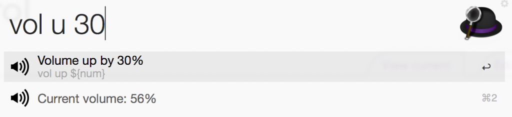 - vol: show current volume - vol $num: set volume to a specified number. - vol mute/unmute: mute or unmute. - vol up [$num]: increase the volume by a specified number. The default value is 10% if the $num parameter is not present. And you can hold cmd to double the increasement. - vol down [$num]: similar to above. - vol max: set volume to 100%. - vol low: set volume to 25%. - vol mid: set volume to 50%. - vol high: set volume to 75%.