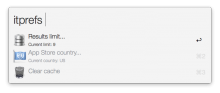 The workflow's preferences (keyword — itprefs) allow you to set the maximum search results limit and preferred store country, as well as clear the artwork cache.