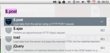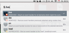 You can see the best results at the top, and some results, which could be interesting with a lower opacity. Removed jQuery functions get a red cross and deprecated functions an exclemation mark sign.