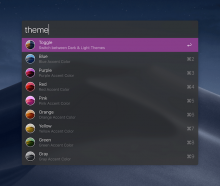 theme purple : toggles between the accent color of your choice variant of this set of themes (replace color with either Blue, Purple, Pink, Red, Orange, Yellow, Green, Gray).