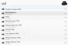 - vol: show current volume - vol $num: set volume to a specified number. - vol mute/unmute: mute or unmute. - vol up [$num]: increase the volume by a specified number. The default value is 10% if the $num parameter is not present. And you can hold cmd to double the increasement. - vol down [$num]: similar to above. - vol max: set volume to 100%. - vol low: set volume to 25%. - vol mid: set volume to 50%. - vol high: set volume to 75%.