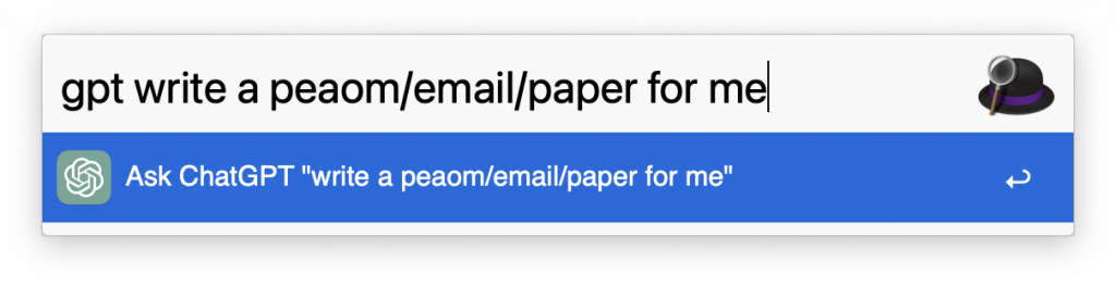 This is an Alfred Workflow that enables you to ask ChatGPT from anywhere while typing. With this Workflow, you can activate it in any window just by typing \\gpt, and it will swiftly generate the content you desire based on your commands. It's like having a genie in a bottle that instantly fulfills your commands!