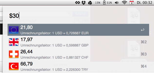 Write "$20.5" or "€ 35,27" and you get some currencies calculated by the current exchange rate. The exchange rate will be updated very often and will be cached. If you have no internet connection the last update will be used.