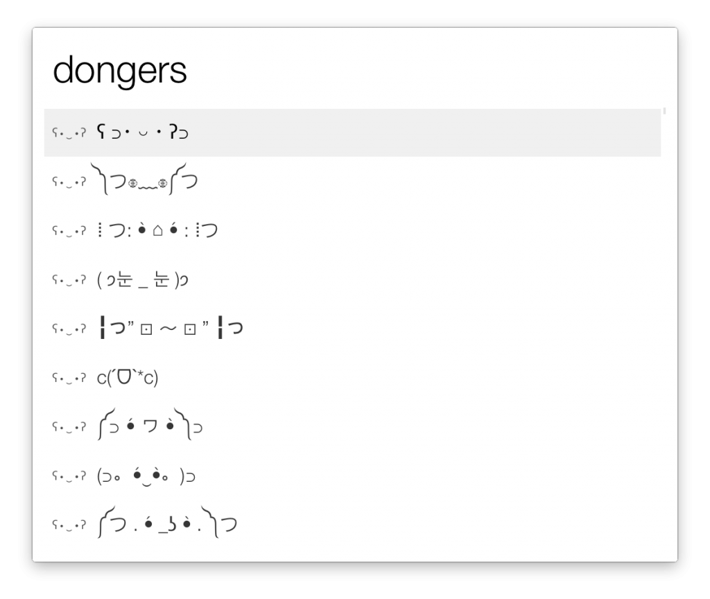 Alfred workflow to quickly browse through dongers (໒( ” •̀ ᗜ •́ ” )७ for example) via dongerlist.com.