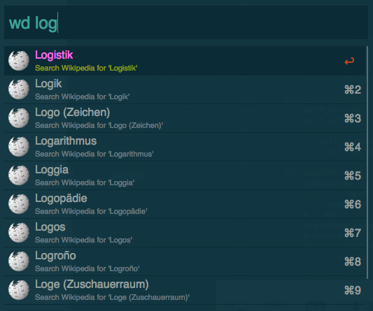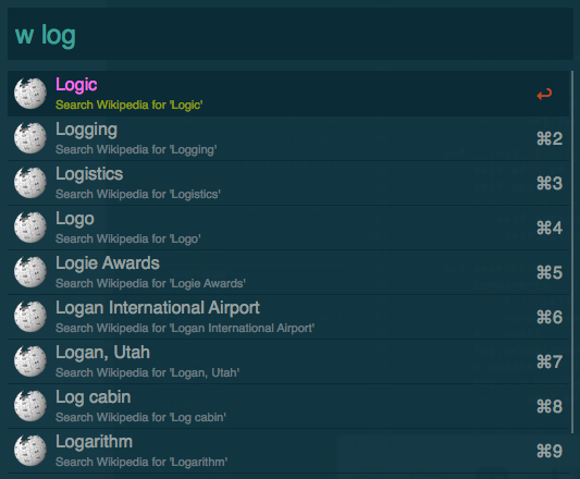 g— Search Google in system (i.e. default) languagem— Search Google Maps in system (i.e. default) languagegi— Search Google Images in system (i.e. default) languagew— Search Wikipedia in system (i.e. default) languagewn— Search Wiktionary in system (i.e. default) languagea— Search Amazon in system (i.e. default) language. If your system language is English, this will search Amazon.com. Use-l ukin the Script Filter to search Amazon.co.uk or-l cato search Amazon.ca.yt— Search YouTube in system (i.e. default) languagesearchio [<query>]— Show settings and list of supported search engines. Currently, the only setting is a toggle to also show the<query>in the results list (default:No).searchiohelp— Open help in your browser