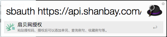 Shanbay OAuth2之后,将完整的 URL 复制下来,并在 Alfred 里面输入sbauth https://api.shanbay.com/oauth2/auth/success/#access_token=xxx&token_type=Bearer&state=&expires_in=2592000&scope=read+write(后面的 URL请替换为你自己复制的 URL) - 授权完成,使用